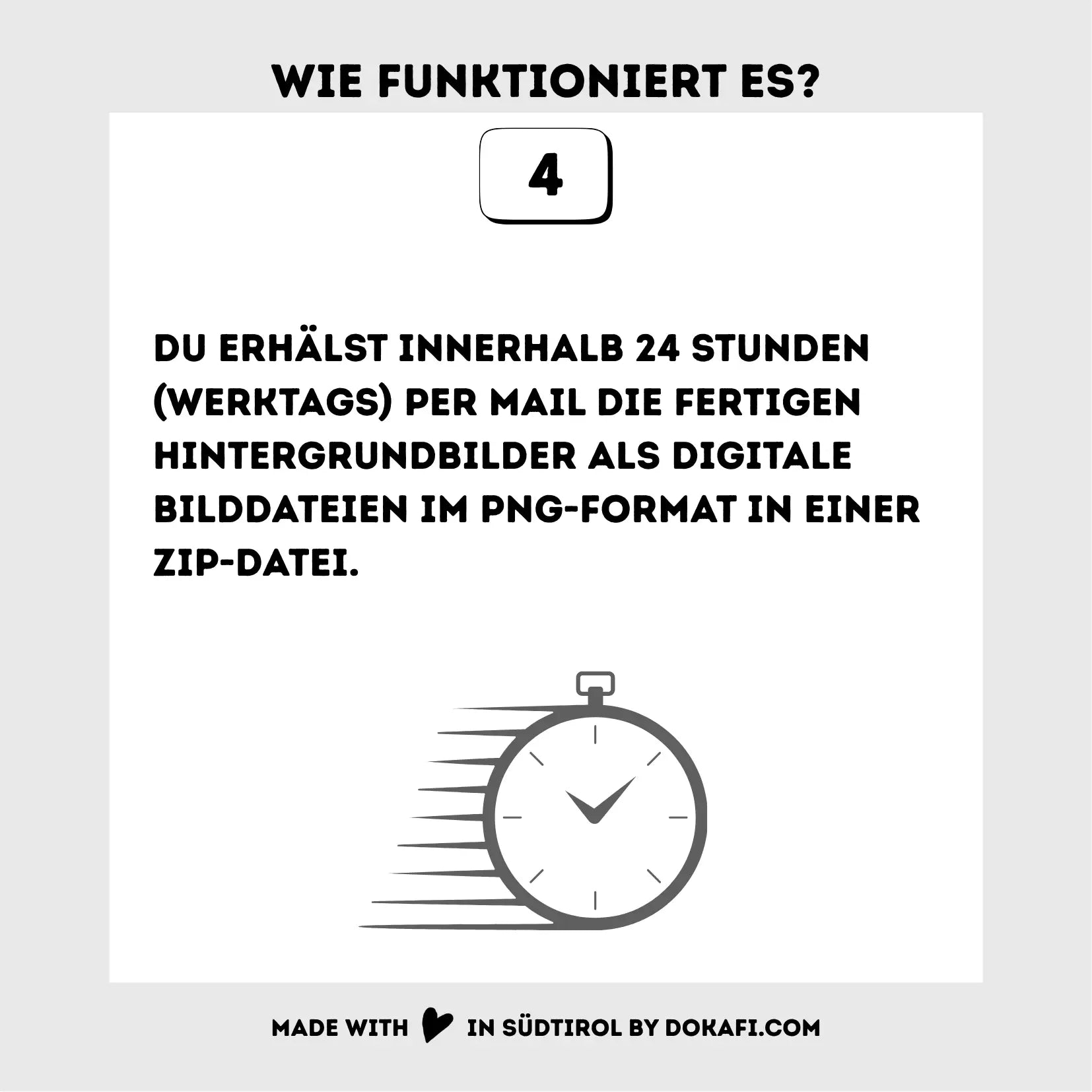 Du erhälst innerhalb 24 Stunden (werktags) per Mail die fertigen Hintergrundbilder als Digitale Bilddateien im PNG-Format in einer ZIP-Datei.