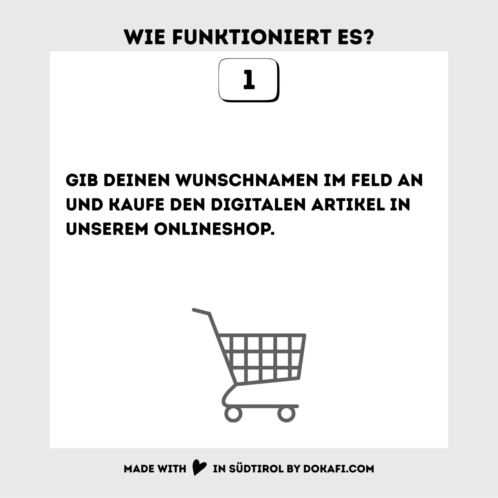 Fülle auf der Produktseite die Felder mit den Infos zur Personalisierung aus und kaufe den digitalen Artikel in unserem Onlineshop.