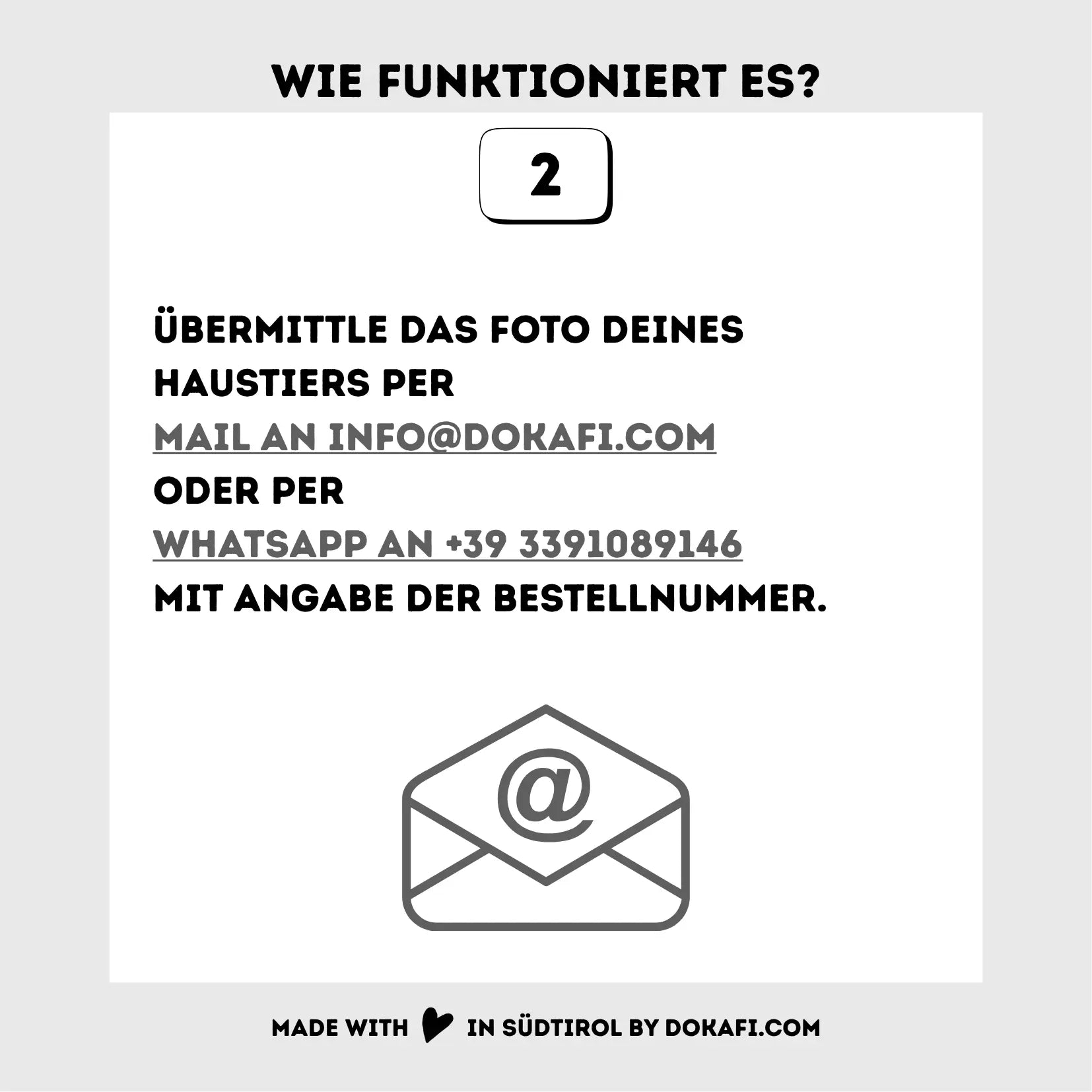 Übermittle evtl. deine Email-Adresse und den Personalisierungstext per Mail an info@dokafi.com oder per Whatsapp an +39 3391089146 mit Angabe der Bestellnummer.