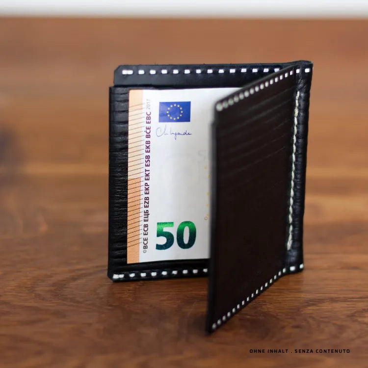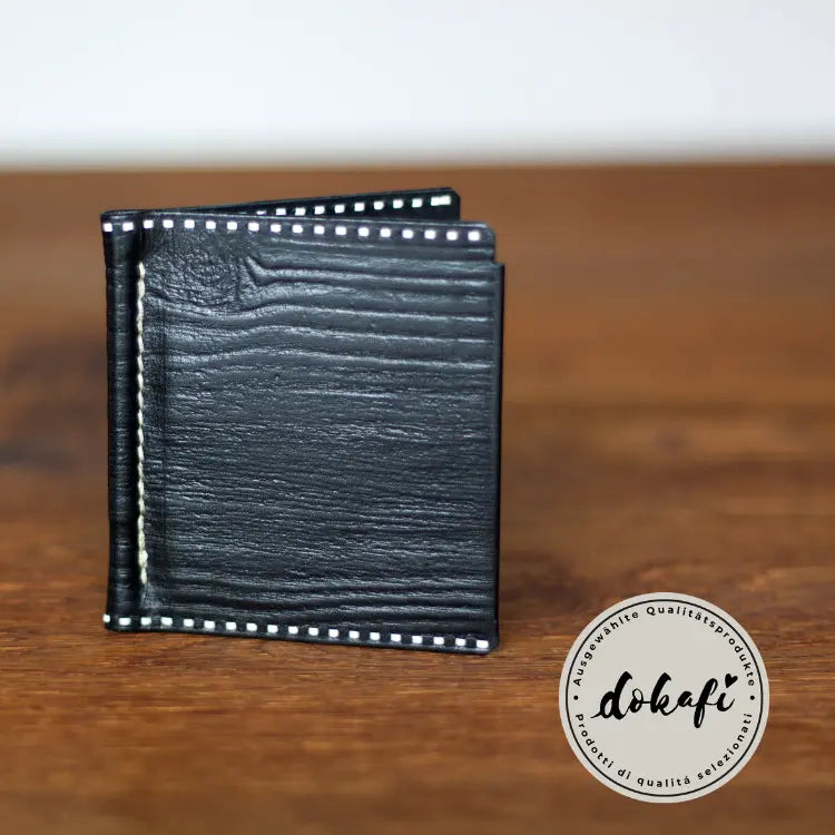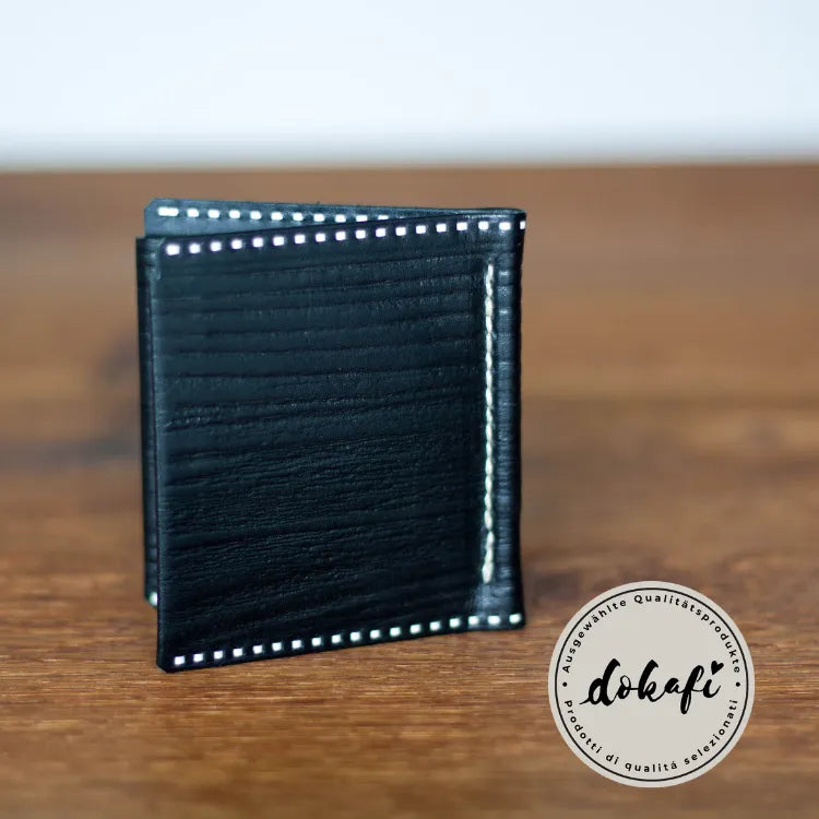 Dieses handgefertigte Kartenetui vereint traditionelles Handwerk mit funktionalem Design. Aus schwarzem Leder in edler Holzoptik gefertigt, besticht es durch feine Nähte mit weißem Federkiel und Baumwollfaden, die stilvolle Akzente setzen. Es bietet Platz für bis zu vier Karten und verfügt über eine integrierte Klammer zur sicheren Aufbewahrung von Geldscheinen. Das Etui verbindet langlebige Materialien mit einem klaren, praktischen Konzept – ideal für alle, die Wert auf Qualität und Ästhetik legen. Südtirol.