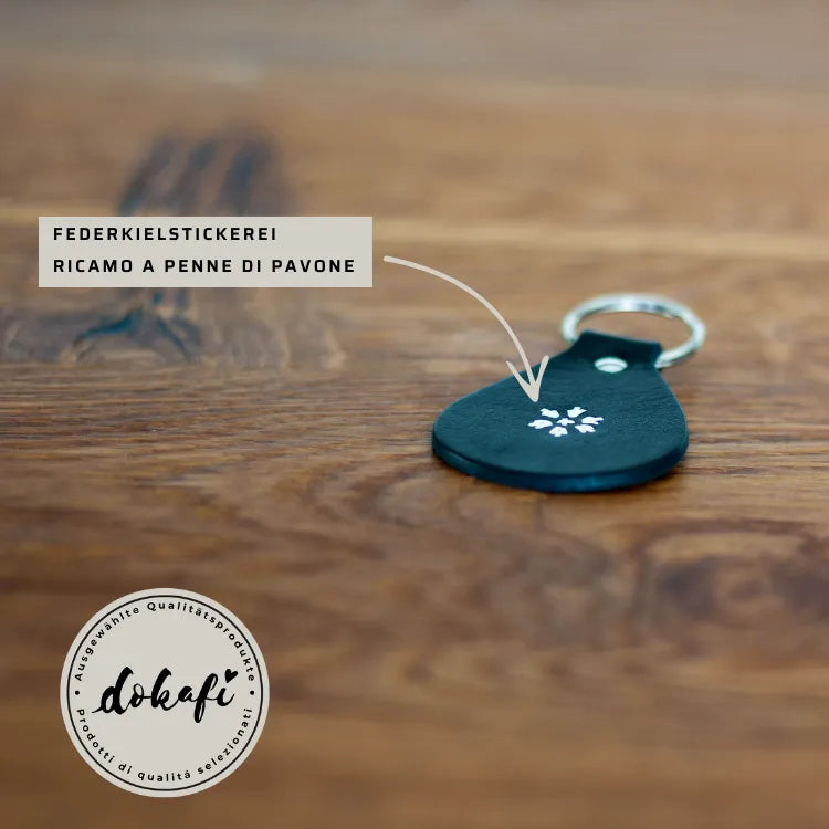 Dieser handgefertigte Schlüsselanhänger vereint zeitlose Eleganz und hochwertige Verarbeitung. Gefertigt aus echtem schwarzem Leder in Tropfenform, bietet er dank des robusten Rings sicheren Halt für Ihre Schlüssel. Das feine Federkielstickerei-Sternmuster setzt einen dezenten, stilvollen Akzent und unterstreicht die handwerkliche Qualität der Manufakturarbeit. Ein langlebiges Accessoire, das Ästhetik und Funktionalität vereint. Südtirol.
